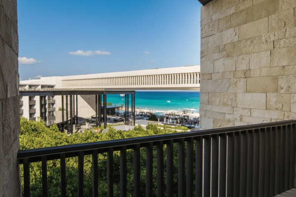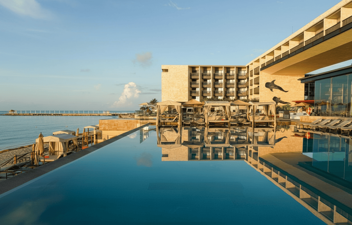 Resort moderno frente al mar con arquitectura inspirada en cenotes y manglares.
