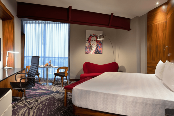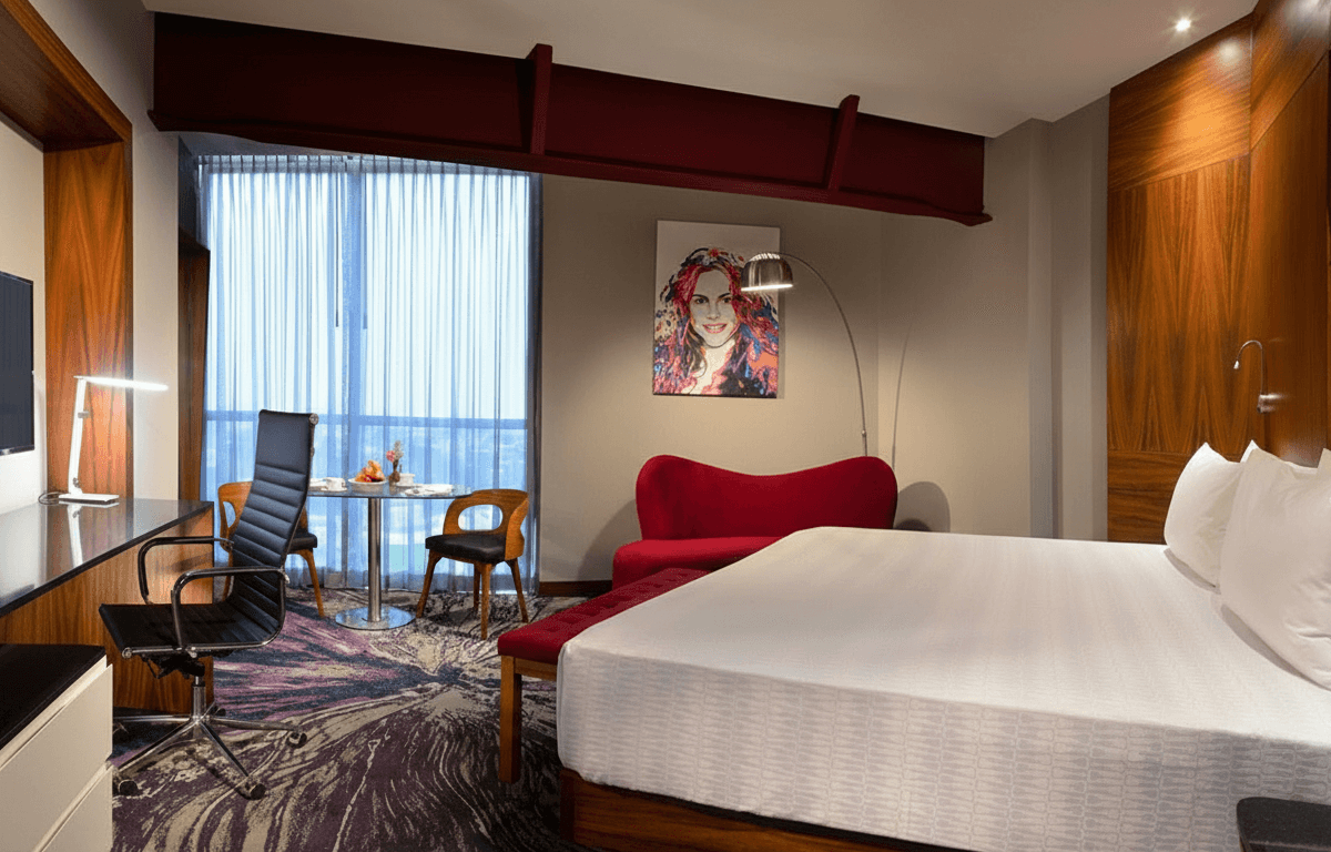 Este hotel destaca por su estilo vibrante y moderno. No es el más tranquilo, pero sí uno de los más atractivos visualmente. Perfecto para quien busca una estancia divertida y moderna cerca de Expo Guadalajara y zonas de restaurantes.