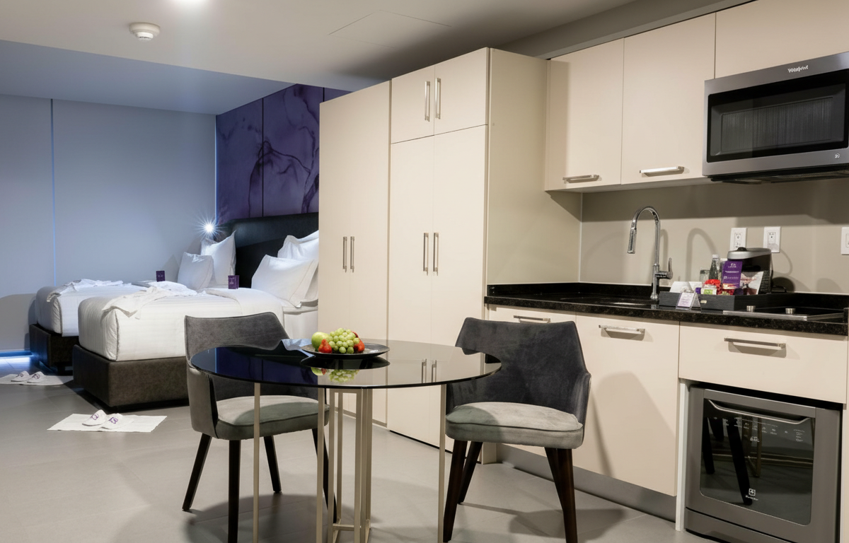 Suites con cocineta, Roof Top Bar & Restaurant, gimnasio de última generación, Wi-Fi de alta velocidad, centro de negocios y lavandería de autoservicio.
