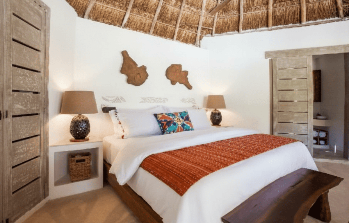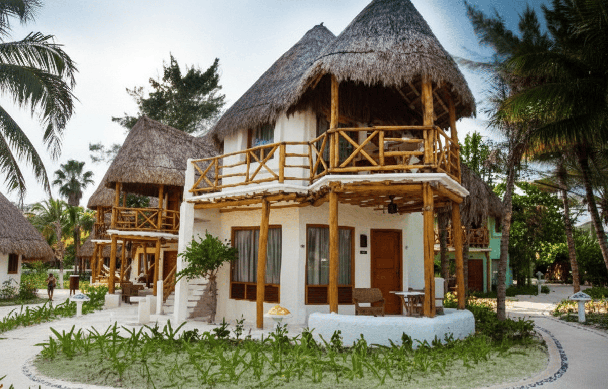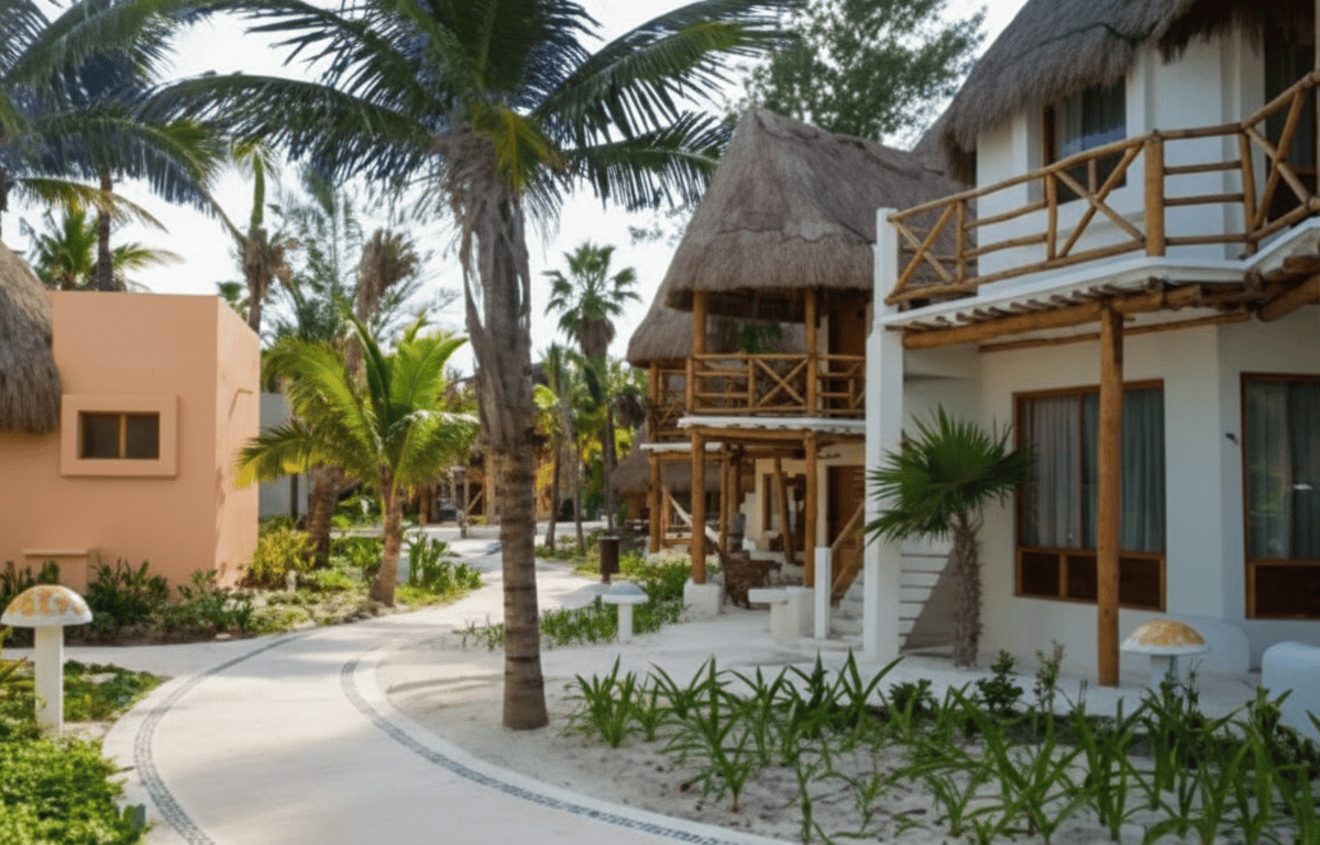 Resort caribeño con estilo bohemio rodeado de jardines tropicales y acceso directo a una hermosa playa cerca de Playa del Carmen.