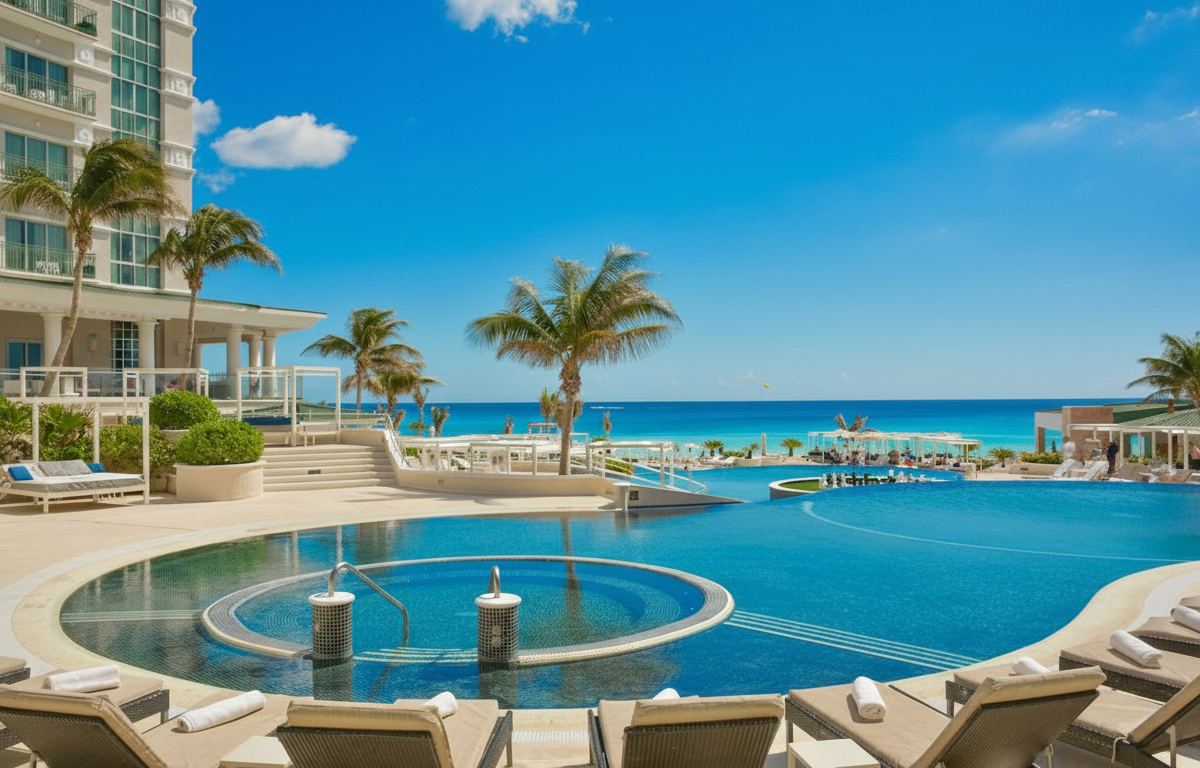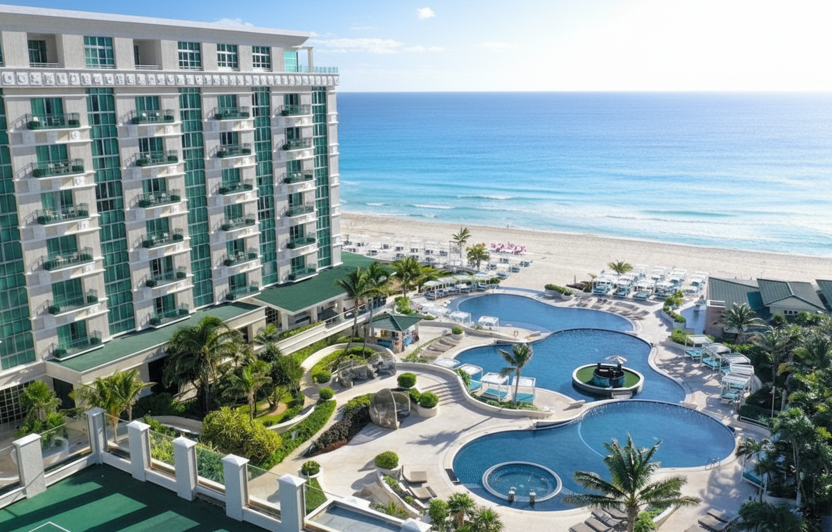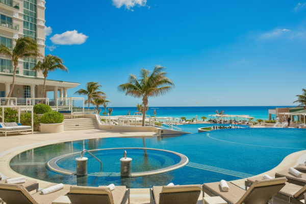 3 piscinas infinity escalonadas, Spa del Mar, 4 restaurantes gourmet, bares de mixología y gimnasio.