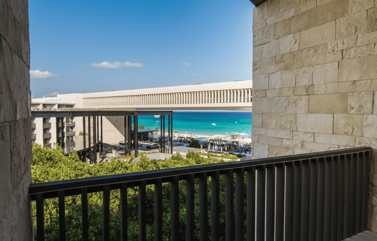Resort moderno frente al mar con arquitectura inspirada en cenotes y manglares.