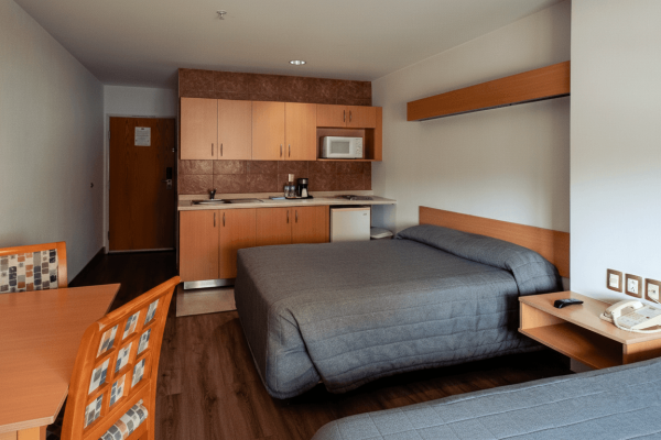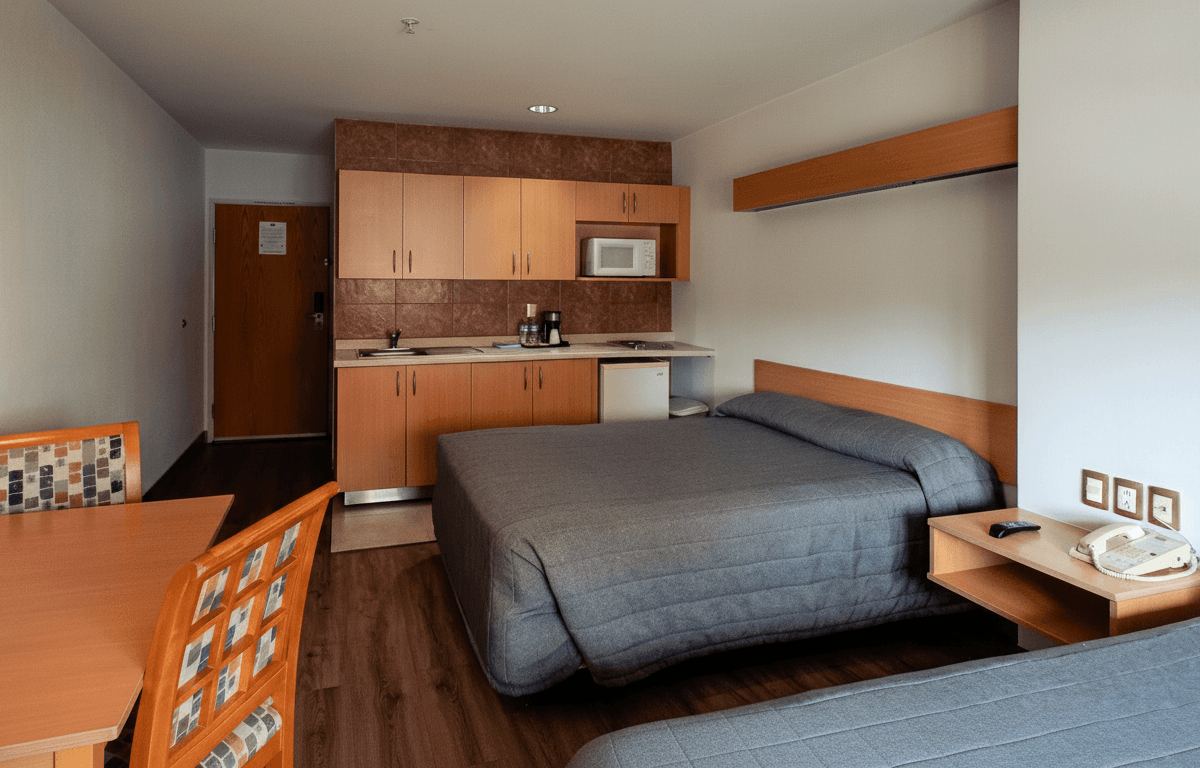 Destaca por su infraestructura de vanguardia y eficiencia. Es un edificio de construcción reciente (2023-2024) con un enfoque en la conectividad total. Las habitaciones están diseñadas con un estilo minimalista industrial, techos altos y ventanales acústicos que bloquean por completo el ruido del tráfico exterior. Es la opción técnica superior para quienes visitan el Technology Park o la zona de Belenes.