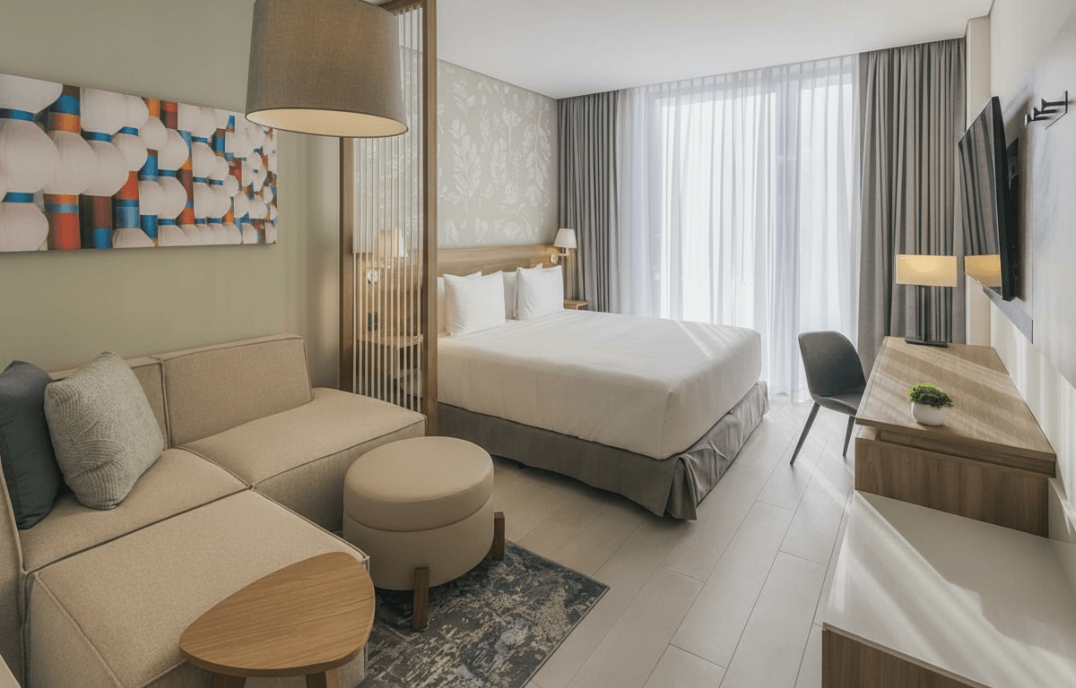Hotel moderno con habitaciones amplias y ambiente relajado, ideal para quienes desean comodidad, diseño contemporáneo y cercanía al aeropuerto.