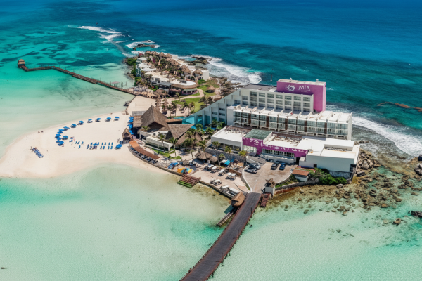 Situado en una península privada con vista 360° al mar, este hotel es una de las postales más reconocidas de Isla Mujeres. Su arrecife natural permite nadar directamente desde la playa, creando una experiencia única. Ideal para quienes buscan descanso, mar cristalino y un ambiente tradicional con servicio cálido.