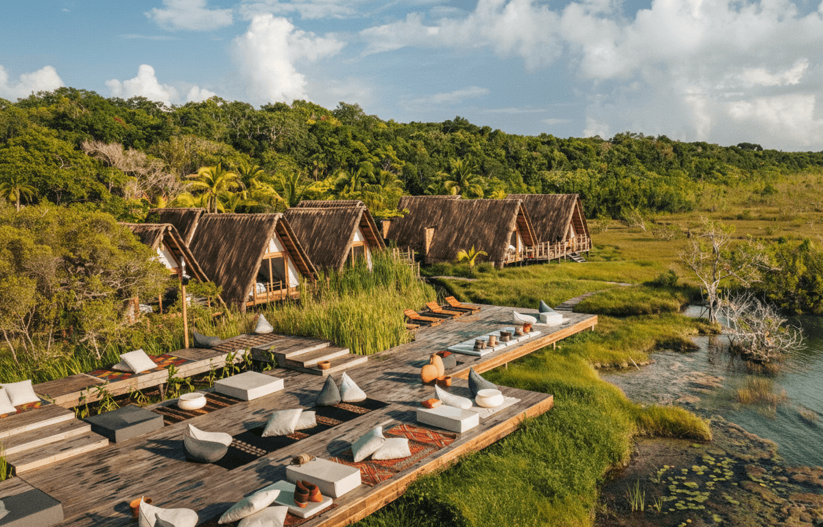 Refugio ecológico de lujo discreto donde la arquitectura se integra con la selva y la laguna. Ideal para viajeros que buscan experiencias auténticas y conexión natural sin perder sofisticación.