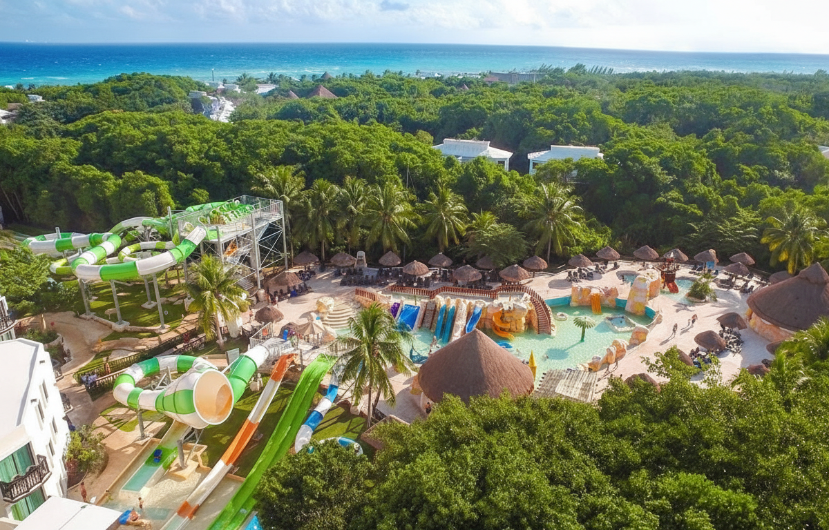 Resort all inclusive con enfoque ecológico y parque acuático, ideal para familias.